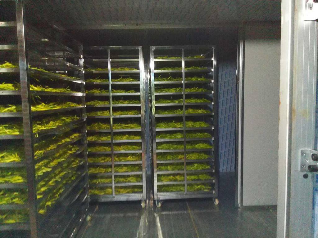 將擺放好黃花菜的物料車推入烘干房內,設定好烘干時段,溫度,排濕量,啟動設備進行烘干。